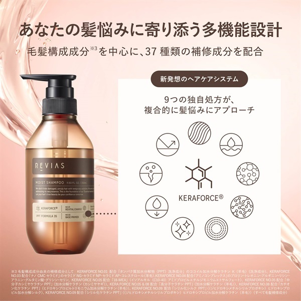 水、セテアリルアルコール、ジメチコン、BG、ベヘントリモニウムクロリド、グリセリン、セラミドNG、セラミドNP、セラミドAP、クオタニウム-33、コレステロール(羊毛)、PG、ジステアリルジモニウムクロリド、コラーゲンアミノ酸、アルギニン、トレオニン、グルタミン酸、アラニン、リシン、プロリン、セリン、グリシン、イソアルキル(C10-40)アミドプロピルエチルジモニウムエトサルフェート、加水分解ケラチン(カシミヤヤギ)、加水分解ケラチン(羊毛)、ヒドロキシプロピルトリモニウム加水分解ケラチン(羊毛)、ベタイン、PCA-Na、ソルビトール、トリエチルヘキサノイン、(ジヒドロキシメチルシリルプロポキシ)ヒドロキシプロピル加水分解ケラチン(羊毛)、(ジヒドロキシメチルシリルプロポキシ)ヒドロキシプロピル加水分解シルク、メドウフォーム-δ-ラクトン、EDTA-2Na、アモジメチコン、イソプロパノール、セタノール、セテアレス-25、セテアレス-7、セテス-13、トコフェロール、フェノキシエタノール、ベヘントリモニウムメトサルフェート、酒石酸、香料